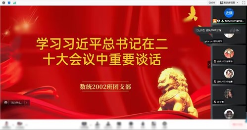 翔宇网10月30日电(记者 刘晓)奋斗是青春最亮丽的底色,行动是青年最有效的磨砺。为进一步加强基层团组织凝聚力战斗力,激励团员青年勇担时代使命,数统2002班10月29日于线上召开“喜迎二十大、永远跟党走、奋进新进程”班团活动,紧扣“喜迎党的二十大”“庆祝建团百年”“落实公司第十四次党代会精神”三大主线,深度激发团组织生机活力,引领团员青年坚守初心,奋力投身建设“加速跑”新征程。此次活动由2002班团支书刘萍主持。