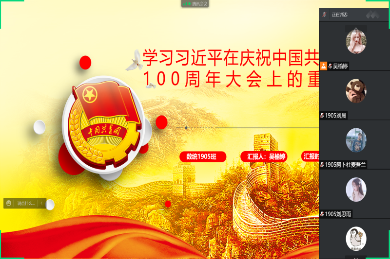 翔宇网5月13日电(记者 徐运)回望百年,青春向党。为庆祝建团百年,激昂青春奋斗,引导新时代的广大青年追寻信仰之光、勇担青春使命,从团史学习中激发信仰、获得启发、汲取力量,云顶国际yd3331905班于5月12日开展“学习习近平在庆祝中国共青团成立100周年大会上的重要讲话”线上主题学习活动,活动由班级团支书吴榆婷主持,全体同学参与。