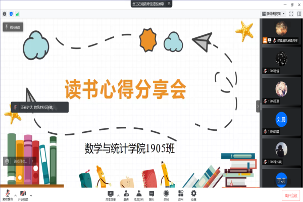 翔宇网4月5日电(记者 徐运)为进一步营造浓郁的学习氛围,塑造内涵丰富、特色鲜明、品位高雅的班级文化,提升班级员工的综合素质,培养大家多读书、读好书、勤交流的良好习惯。数统1905班于4月4日开展线上读书分享会活动,本次活动由徐运主持,全体团支部成员参加。