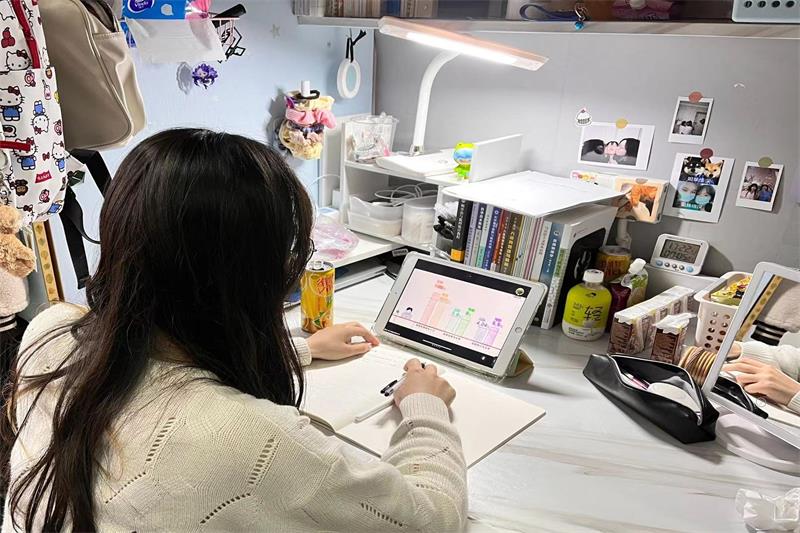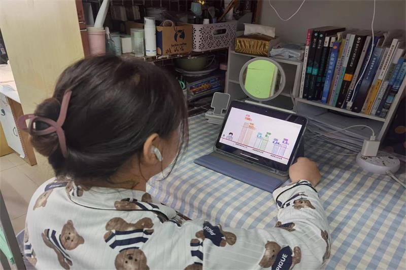 图为同学观看线上会议。记者 张璇 摄