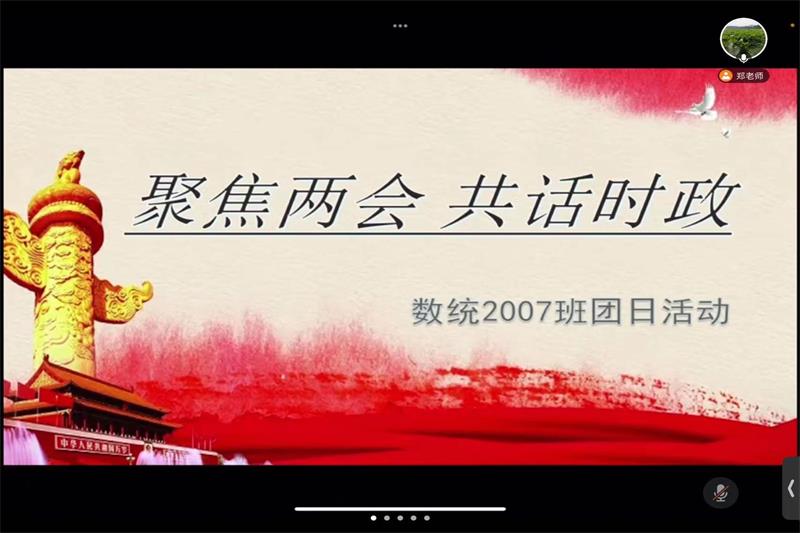 翔宇网4月4日电 记者(刘怡 张璇)为使同学们更好的宣传和学习两会精神,引导大家积极关注国家政治活动,2022年4月3日下午,数统2007班于线上开展了“聚焦两会,共话时政”团日活动。本次会议由张璇主持。