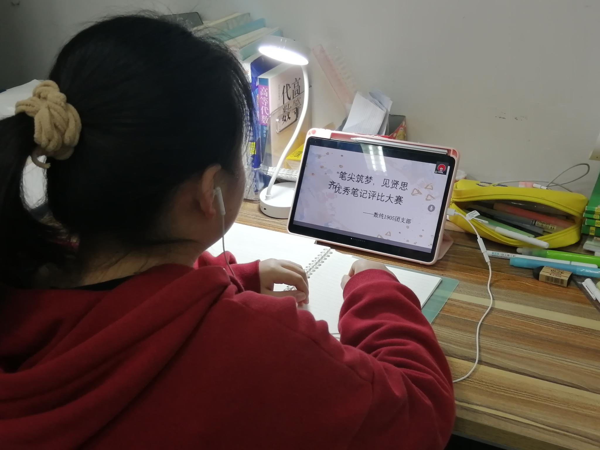 图为同学观看线上会议。 记者 钱晨曦 摄