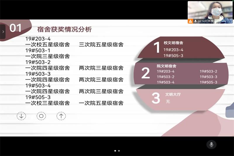 活动伊始,由主持人介绍本次活动主题及班级宿舍获奖情况,并由校文明宿舍19#505-3代表葛倩倩向大家展示宿舍风采,在整洁绚丽的宿舍中,大家领悟到周恩来精神和数学的魅力。随后,由陈欣雅同学就各个宿舍提出的优缺点进行总结,她表示班级宿舍在卫生整洁、学习氛围等方面做的较好,但在宿舍作息、宿舍安全等方面还存在一些不足,各宿舍需要有针对性地改善。最后刘燕雯对宿舍卫生、宿舍安全、宿舍氛围进行强调,在宿舍内务方面,桌面要保持整洁,上课时间段整理好床铺,宿舍和大厅确保干净整洁并张贴相关值日表,宿舍安全方面则要保证无人时拔掉插头和钥匙,禁止使用违规电器,大厅内无空纸箱、塑料瓶等易燃物品。同时,一个积极的宿舍氛围更有利于同学们在轻松的氛围里更好地学习、生活。