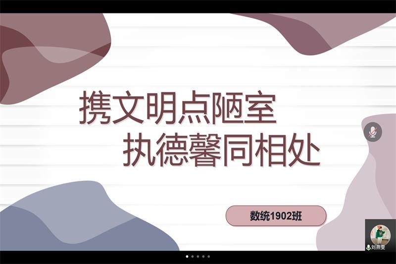 翔宇网3月31日电 记者(刘祈岑)为培养优良的学风舍风、树立互相帮助、共同进步的团队意识,形成健康高雅的宿含文化氛围,数统1902班于3月30日下午举行“携文明点陋室 执德馨同相处”舍风情况分析活动,本次活动由生活委员刘燕雯同学主持。