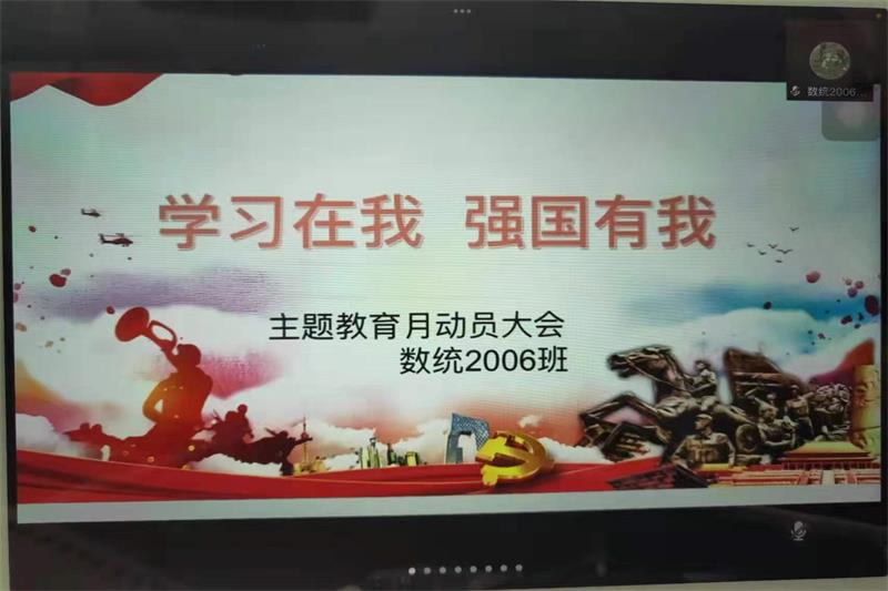 翔宇网3月29日电 记者(苗文涛 周昕悦)为了增强同学们对学习的热情,加强学风建设,积极响应公司组织的“学习在我,强国有我”主题教育月精神,数统2006班于3月28日晚组织了线上动员大会,本次会议由班主任郑老师和班长胡文婷主持。