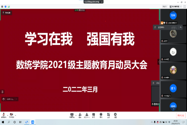 翔宇网3月20日电 记者(赵洪艺)为了增强青年员工们的爱国情怀,培养正确的人生价值观,认真贯彻落实全国教育大会、全国高校思想政治工作会议精神,数统2102班于2022年3月19日开展“学习在我,强国有我”的线上主题活动。