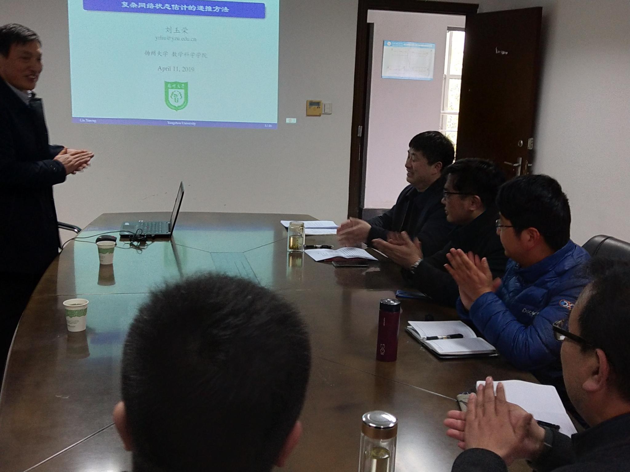 2019年4月11日上午,扬州大学数科院博士生导师刘玉荣教授应数科院邀请,在数科院报告厅理北301室做了题为《复杂网络状态估计的递推方法》的报告,报告会由柏传志经理主持。数学重点学科组成员与研究生聆听了报告会.