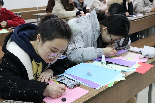 除了让人印象深刻的观影活动,其余的活动也在如火如荼的展开。大家踊跃参加,现场气氛活跃热烈。编发活动现场,女生们在学习编发技巧的同时,相互交流分享平时生活中的编发经验。通过多变的发型与巧妙的编发手法,展现青春的张扬与美丽。另一边,女红工作坊的同学也开始了她们的美妆教程。粉底、睫毛膏、口红、眼影……化妆工具种类所含甚多。在女红同学的精湛技艺下,一张张仙女的面孔陆续绽出。紧接着,心灵手巧的女生们也开始了手工DIY大赛。一张张栩栩如生的剪纸,一幅幅充满春意的贴纸,展现了女生们别样的风采。活动最后环节,一念瑜伽社团的会长带领大家进行了几组瑜伽练习,用瑜伽唤醒身心,激励同学们在忙碌的学习生活中不忘身心锻炼,增强体质,促进身心健康。活动结束后员工会成员将男生们写的祝福卡片献给女生们,把祝福传递给每一个女生,并和所有到场女生合影留念,记录这一美好的时刻。