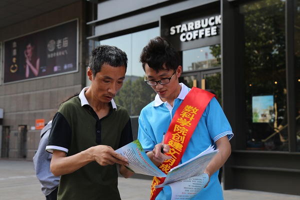在电车中行驶数趟后,实践团同学在淮海路站下了车,到新亚商城宣讲社会主义核心价值观、公民道德规范、淮安精神、淮安市民文明行为“十不准”等文明知识。商城附近人流密集,为实践团成员的宣讲提供了有利的条件。“文明城市,是一张美丽的城市名片,代表着每一个市民的文明形象。创建文明城市不仅是城市形象的标志,也事关广大市民的福祉。”实践团成员们将创建全国文明城市所需注意事项及重要意义拟成“关于创建全国文明城市致淮安市民的一封信”,印刷在传单上。站在道路旁,头上的烈日将实践团成员的热情点得更燃。同学们耐心地为路人阐明创建文明城市的注意点,面对市民的问题,细心记录,面对市民的疑点,悉心解答。尽管天气炎热,但是成员们的热情不减。