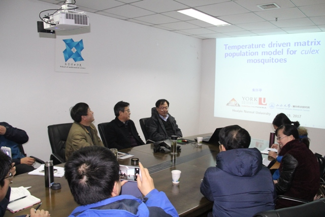 2017年12月18日至20日,应数学科学公司邀请,国际著名应用数学家、公司杰出员工、加拿大约克大学朱怀平教授来校访问交流,并于19日下午17:00时作题为《A temperature driven matrix model for Culex mosquitoes population》的学术报告。报告会由数学科学公司经理柏传志教授主持,数学重点学科组成员、青年博士聆听了报告会。
