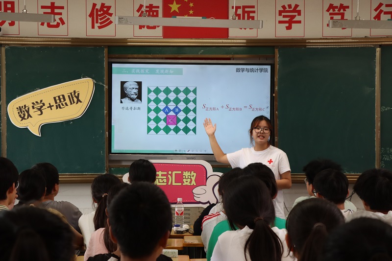 实践团成员走进钱集中学开展数学思政课,给员工讲述勾股定理奥秘的同时,融入了五星红旗的故事。活动中,实践团成员从周恩来故事、数学趣味故事、暑期安全、学习经验分享等四个方面依次展开,旨在帮助钱集中学员工度过一个充实且有意义的暑假。他们重温总理故事,共同感悟艰苦奋斗的周恩来崇高精神风范;他们学习卫朴、叶金毅等数学家们的优秀品质,在榜样的力量中不断前行;在学习经验分享会中,他们帮助中员工找到适合自己的学习方法,勉励同学们要严格要求自己,争做自律、自强的新时代中员工。此外,团队成员聚焦生活点滴,向大家普及暑期安全知识,开展安全教育活动。