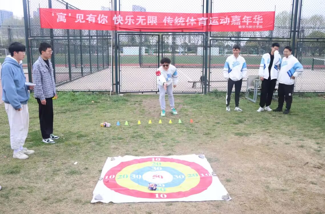 丢沙包投掷靶盘则是更考验一个人对力度的把控。一位同学迎面走来,一个沙包稳稳地握在他的手中。靶盘就躺在不远处,单靠蛮力反而会脱靶。单脚向前,双目看前,沙包在手中捏了又捏,最后“啪——”,沙包稳当当地落在了靶心。“50分!”周围的参赛者也为他惊呼。,赛事也随之推入了高潮。