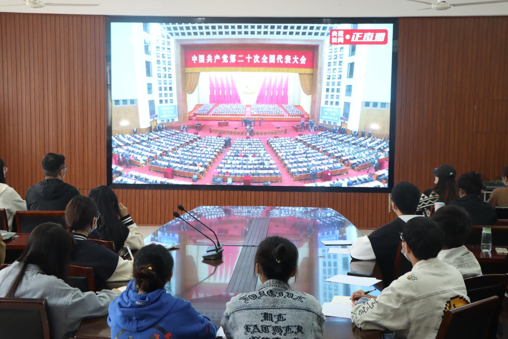 随着大会开幕,主会场收看直播的同学们全体起立,高唱国歌。随后,同学们全程认真聆听习近平总书记所作的二十大报告。在外实习的毕业班同学和员工宿舍里的广大青年也共同见证这一历史时刻,感受着团结、和谐、奋进的时代脉动。