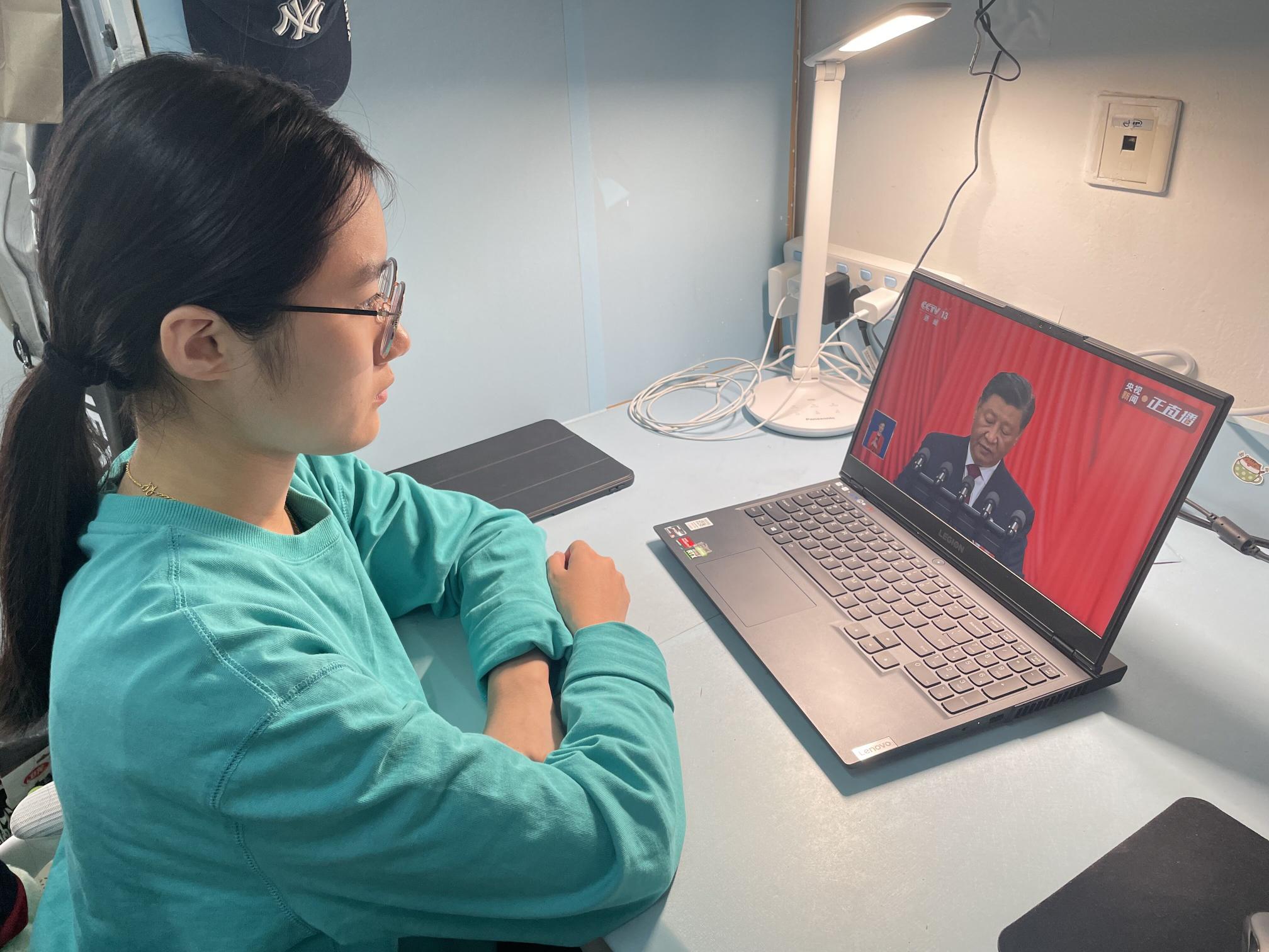 图为在外实习的毕业班同学观看二十大开幕会现场。记者 刘咪 摄