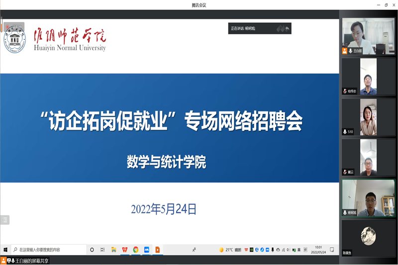 数学与应用数学(师范)专业杨轲旭、统计学专业卫树婧两位员工在线作了自我推介,表达了自己心仪的单位,希望能与招聘单位达成就业意向。其他同学通过电子邮件、网络互动等方式与心仪的招聘单位进行沟通和自荐。