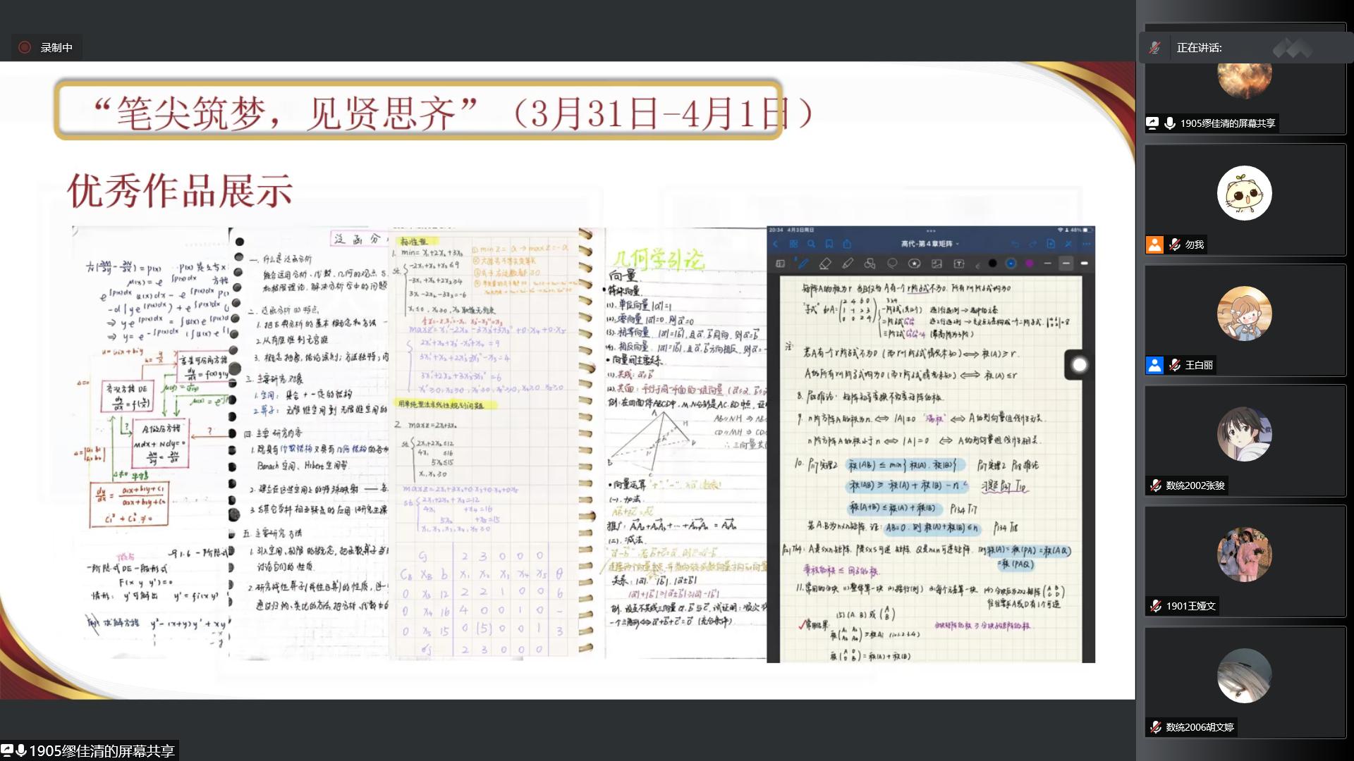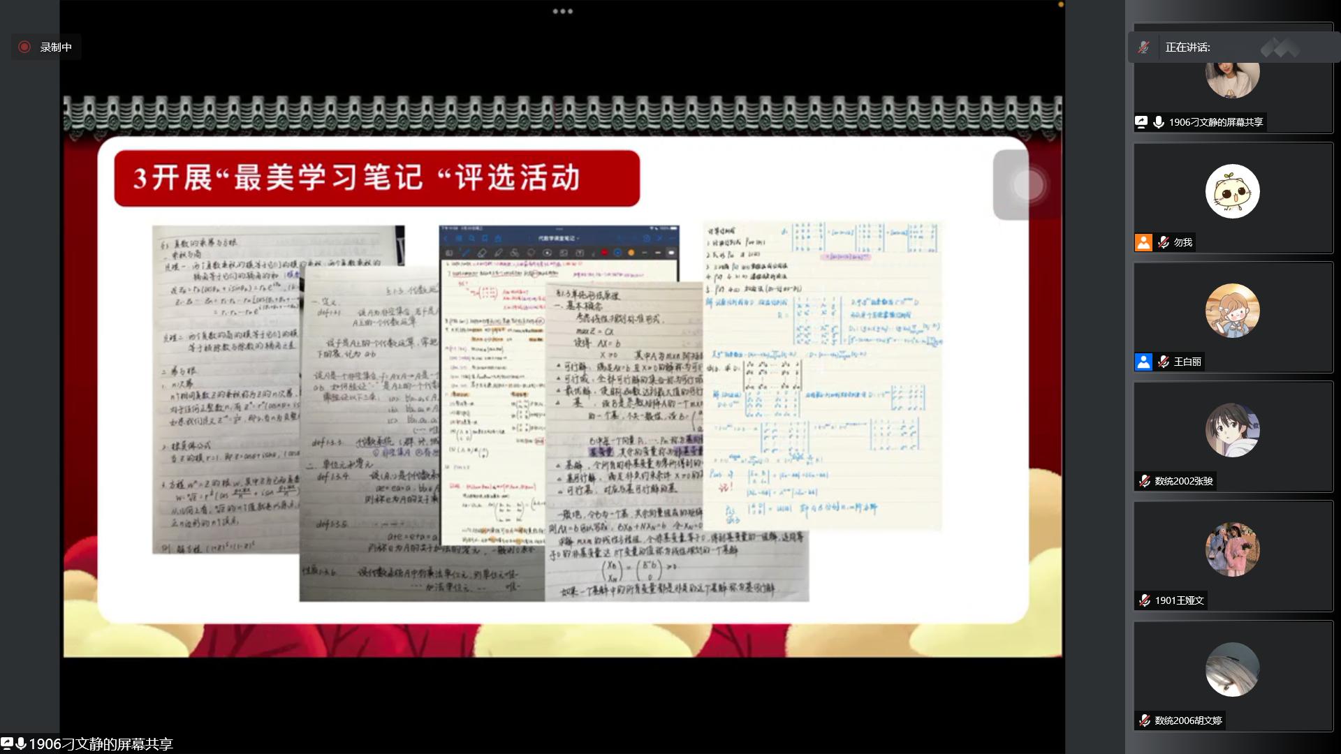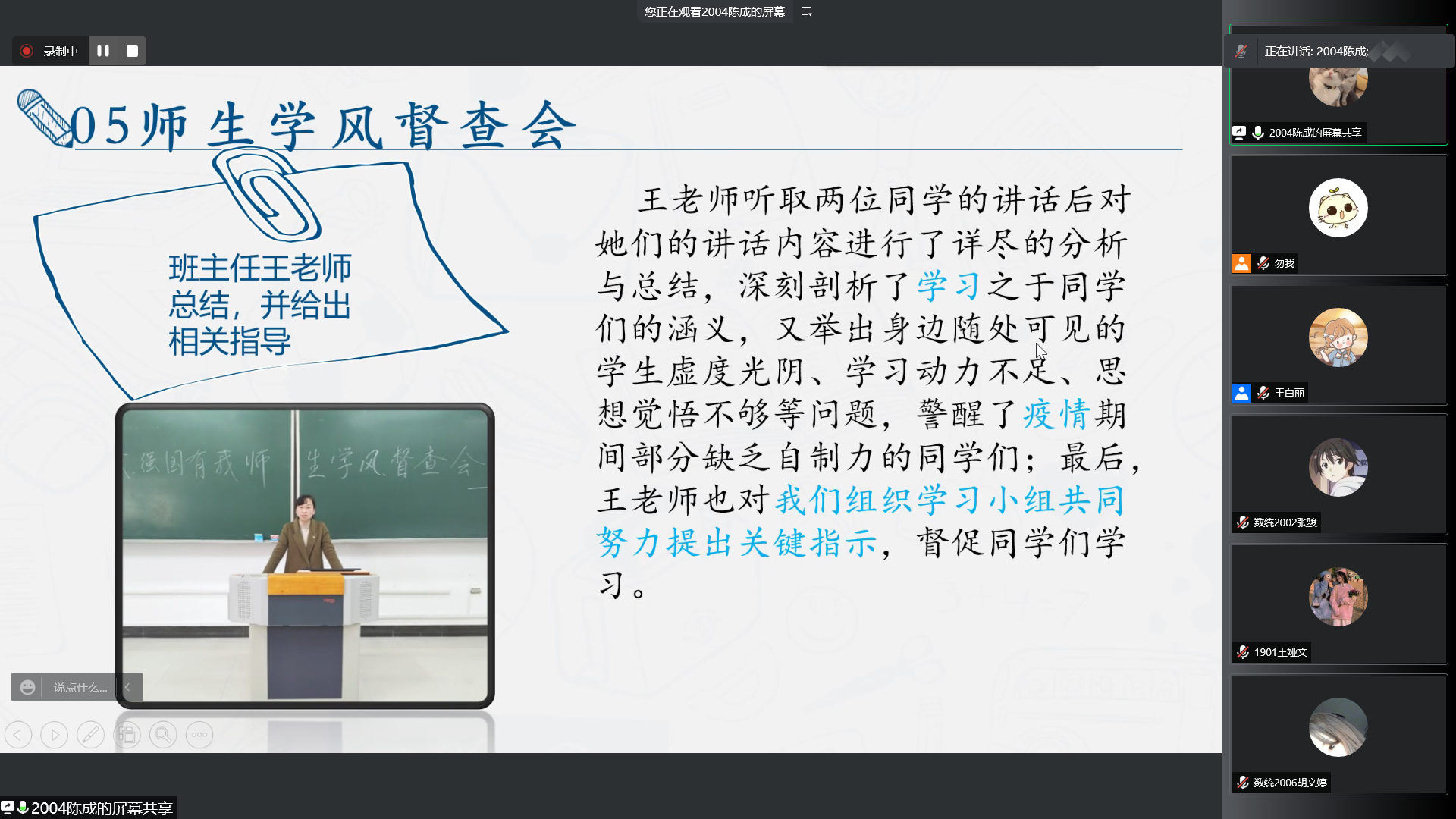 2007班班长高瑞结合班级实际情况,从活动目的、活动流程、最终成效三个方面进行了汇报交流。高瑞认为,为积极响应公司“学习在我 强国有我”主题教育月号召,班级邀请戴云、吴以立老师、班主任郑发美老师参加班风学风自查主题班会。通过班委对班级课堂问题的观察总结和同学们自身反思,巧借短视频这一新颖趣味的形式将学风、班风上的问题具体展现,并针对学风问题清单,逐条探讨,形成了有关学风建设的班级公约,为同学们今后在课堂学习与时间规划上给予了多方面的指导,为处于迷茫之中的同学指明了努力的方向。同时,班级还举办了考研、考证、考编学习经验交流会,学长学姐对同学们教资准备、考研复习等方面做出了战略性指导,通过学习资料的正确选择以及备考方式的合理安排,提升同学们的专业竞争力。1902班罗梦蝶认为,培养乐学、善学之风的基础在于班级特色整改方案的逐步落实。班级举办了“严班风,律己身”学风建设主题班会,班主任尹洪辉老师充分提醒同学们时间合理规划的重要性,要在当下用勤奋努力为今后不同选择打下坚实基础。在此基础上,罗梦蝶为提升同学们的自我管理意识,邀请班级内学习优秀的同学对学习方法、作息安排进行分享,为同学们树立了身边的典型榜样,有助于形成系统的学习体系。同时,考虑到部分同学在学习上存在困难,罗梦蝶倡导成立了学习小组,通过一对一的针对性指导,以点带面,在班级内形成互帮互助、携手进步的良好学风。