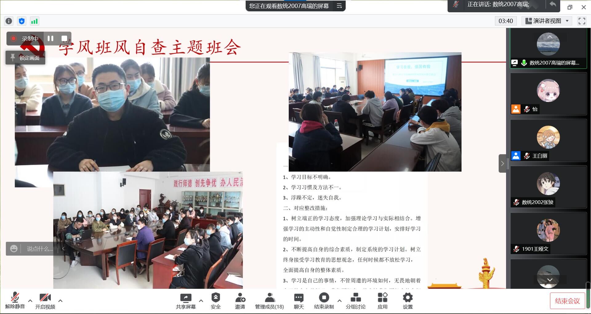 活动伊始,各班班长依次用PPT汇报的形式展现了近一个月来各班组织开展的主题教育月活动进展,客观详实地呈现了班级在学风建设方面存在的问题、整改措施进而形成班级公约。