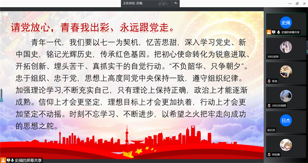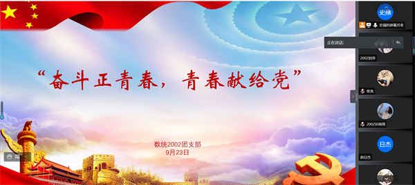 翔宇网9月24日电 记者(叶雨昕 刘萍)为推动党史学习教育走入深实,激发团员爱党、爱国热情,强化团员“强国有我”的责任担当,云顶国际yd3332002班于2021年9月23日下午在腾讯会议举行了“请党放心,强国有我”主题团日活动“奋斗真青春,青春献给党”,本次活动由团支书史蘋负责。