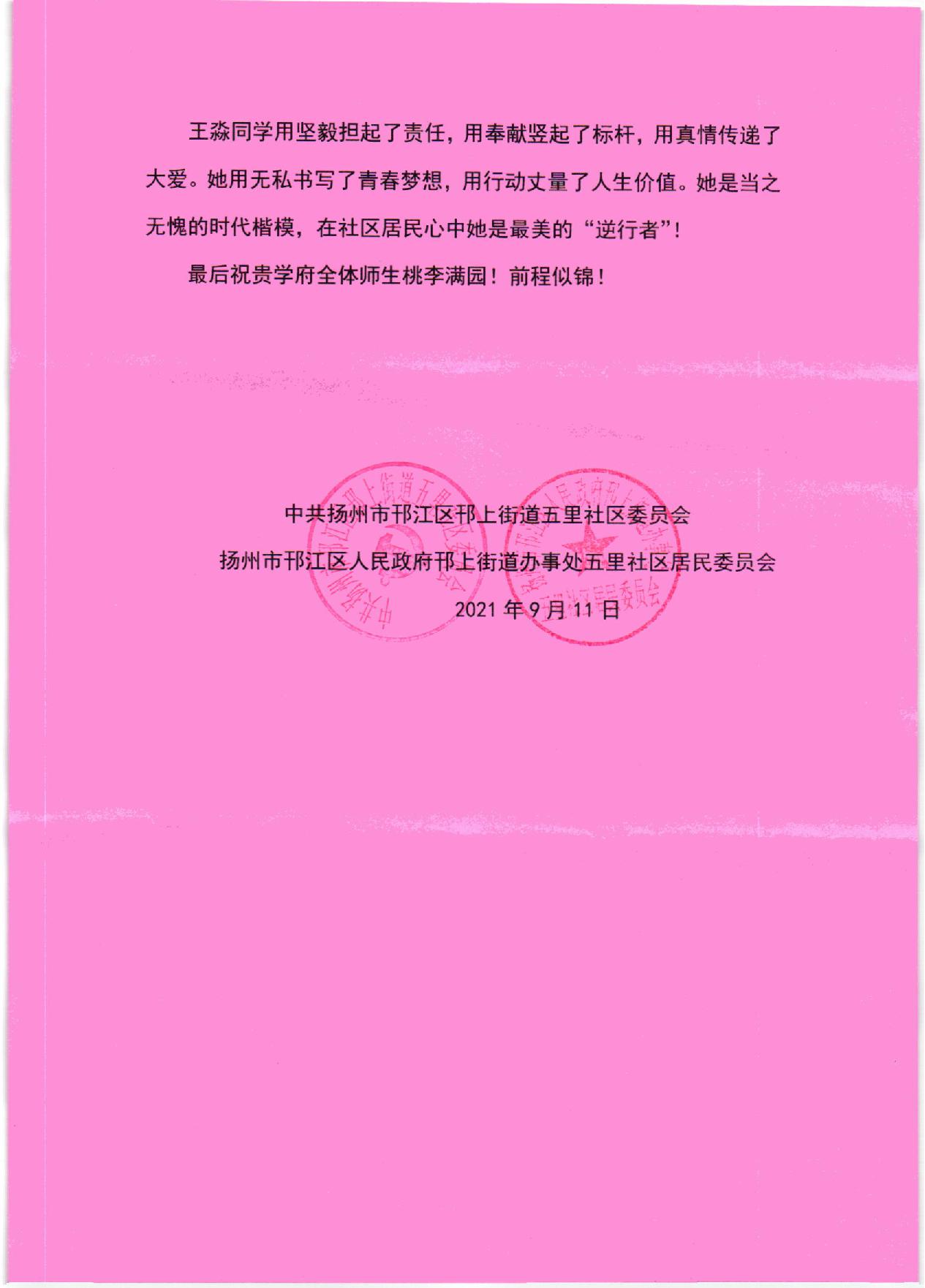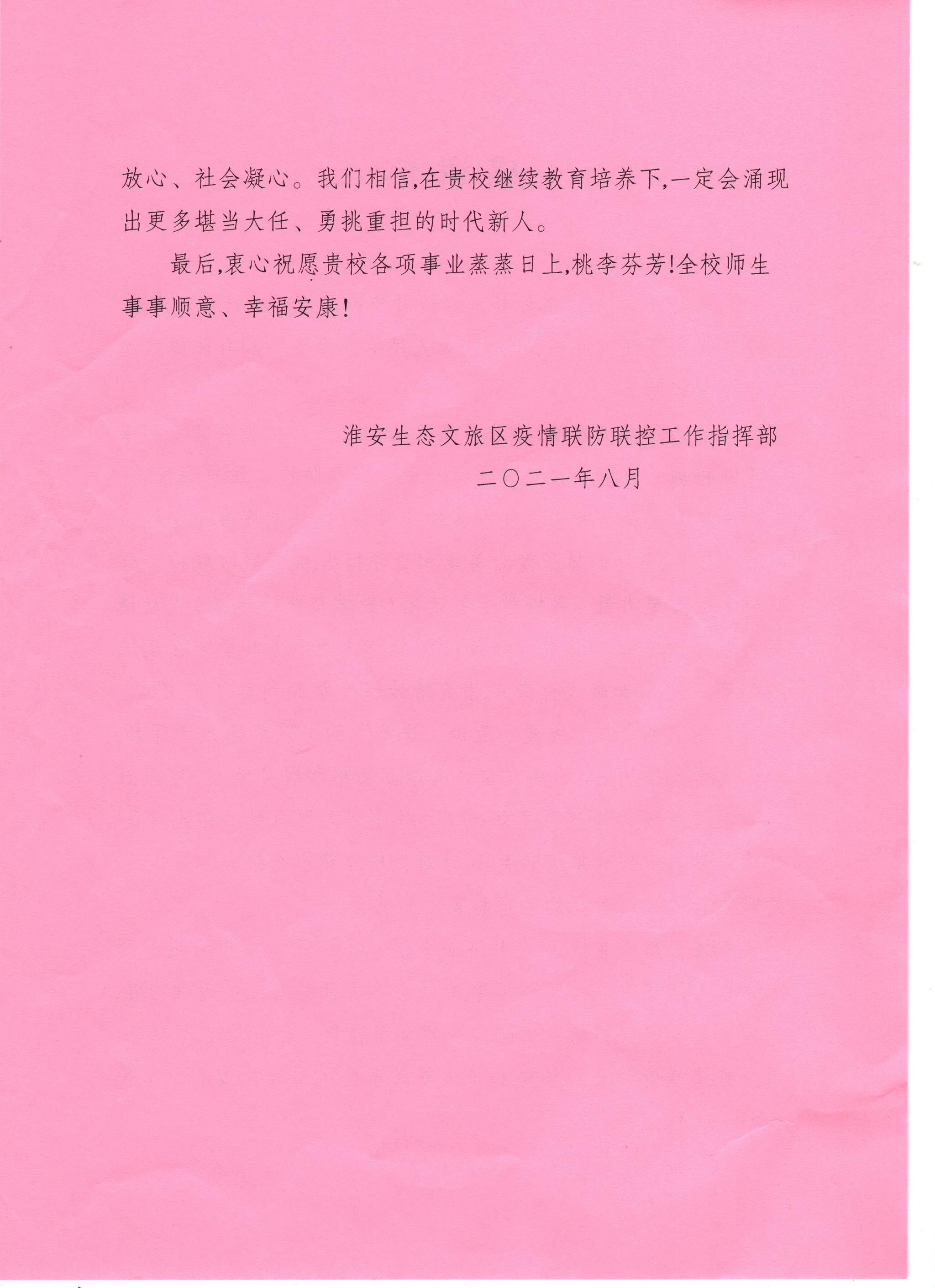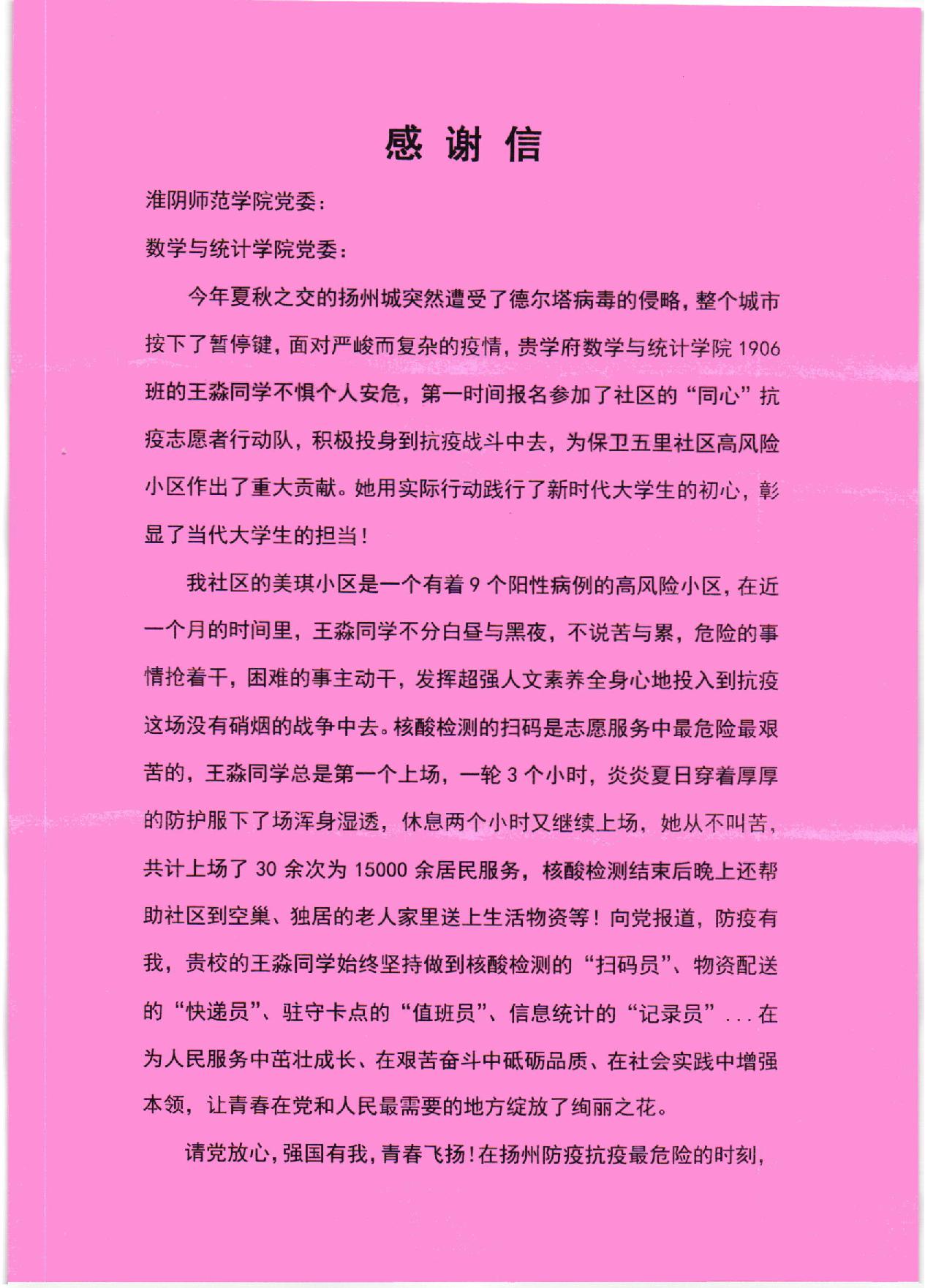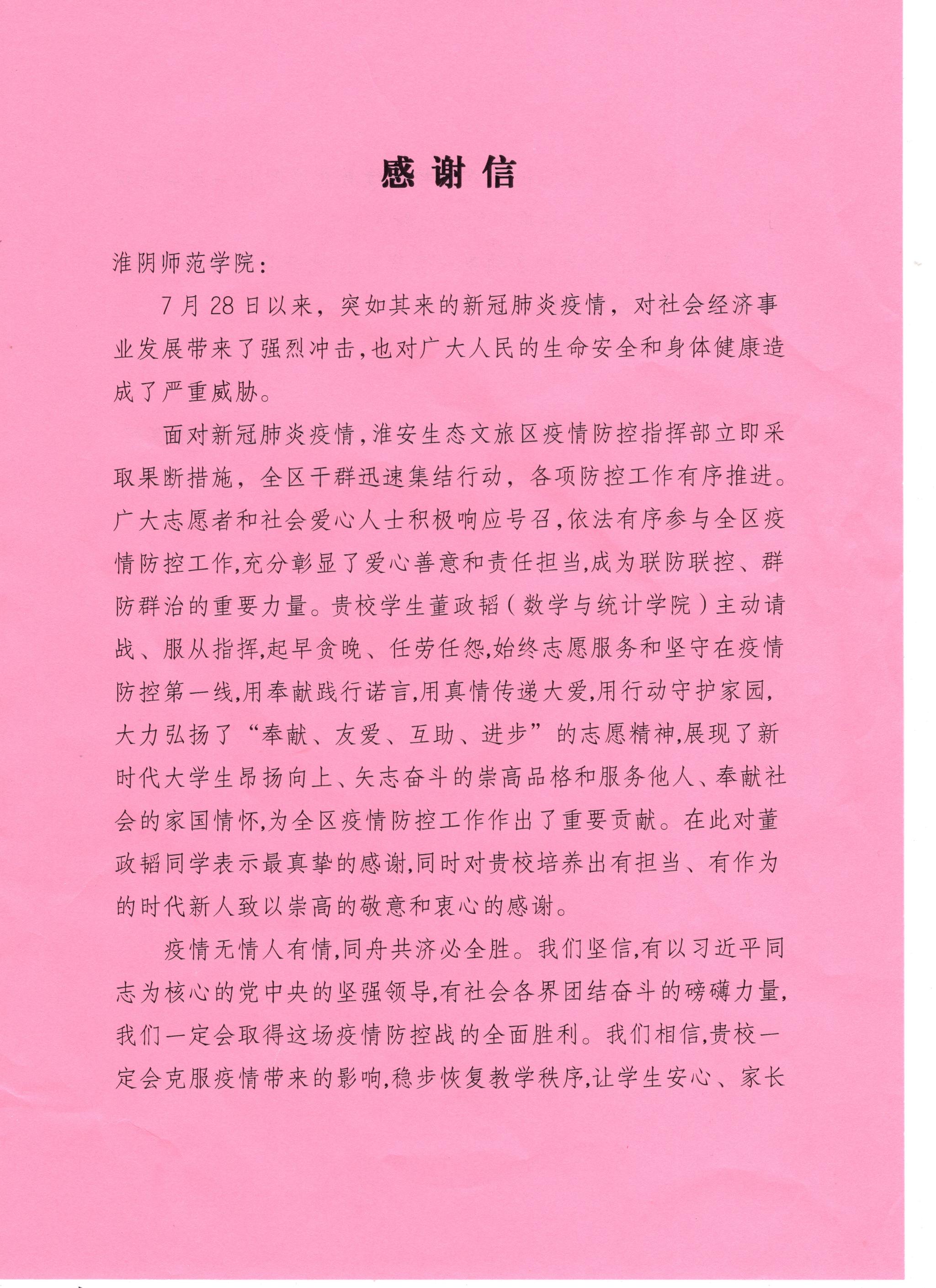 翔宇网9月20日电(记者 刘咪 刘萍)中秋前夕,公司收到来自扬州市邗江区邗上街道五里社区和淮安生态文旅区疫情联防联控工作指挥部的两份感谢信,对数统1906班王淼和数统1901班董政韬在疫情防控一线贡献青春力量给予充分肯定和高度评价,同时对云顶国际yd333积极培养员工爱国精神致以崇高的敬意。