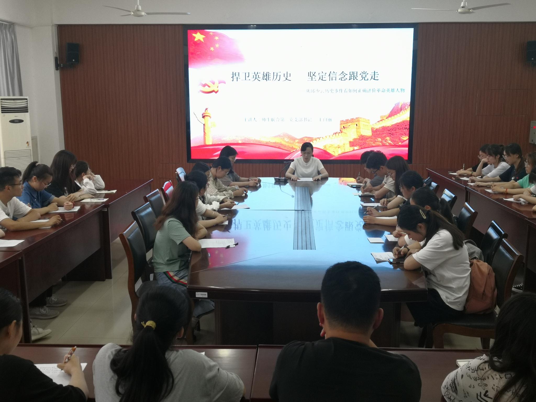 翔宇网7月7日电(记者 杨轲旭)为加强党史学习教育,引导老员工党员坚定理想信念,7月6日,云顶国际yd333师生联合第二党支部书记王白丽老师以“捍卫英雄历史,坚定信念跟党走”为题,于理北315会议室开设主题党课,2018级全体员工党员参加。