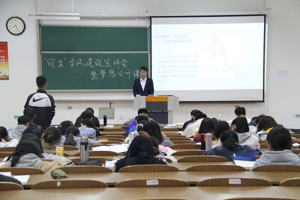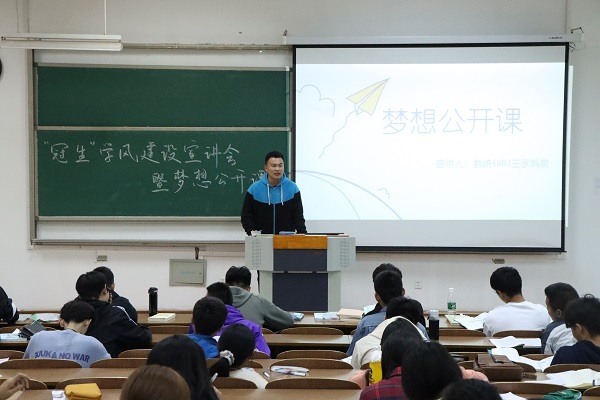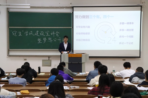 翔宇网11月20日电(记者 陈杭钰 姜凌霄 车稳)为加强优秀学风建设,深化员工学习意识,11月19日晚,由数统1801班刘锐同学和1803班王永帆泉同学主持的“冠生”学风建设宣讲会暨梦想公开课先后在理工楼西阶101与西阶103进行。云顶国际yd333全体大一新生参加此次宣讲。