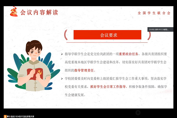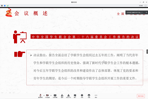 上午十一时,会议正式开始,主持人明确此次会议的目的及意义,带领与会成员共同回顾全国学联二十七大的主要内容,从会议强调、会议要求、大会号召三个方面对全国学联二十七大会议进行深入分析,传达了全国学联二十七大的基本概况、学联工作报告的主要内容。随后重点对习近平总书记贺信做出全面深刻的解读,并强调在习近平新时代中国特色社会主义思想理念指导下,团学干事应以贺信精神全心全意为员工服务。最后,主持人进行会议总结,鼓励员工干部务实奋发,用更加饱满的精神状态服务广老员工。
