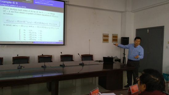 马欣荣教授的报告介绍了以参数替换为基础的所谓的SP算子在基本超超几何(q-级数)中的应用,并由此证明了一些已知的基本变换公式的证明, 以及Weierstrass theta 恒等式和Watson 2phi1变换公式之间的等价性。他的报告通俗易懂,既有理论深度,又有应用价值。马欣荣教授的报告让各位教师受益匪浅。报告会在一片的掌声中结束。