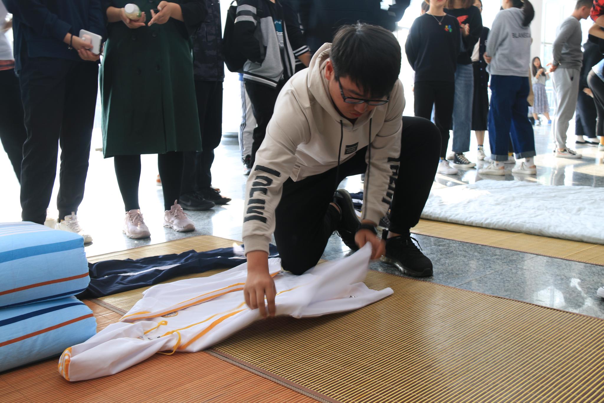 赛前,选手们个个摩拳擦掌,准备大显身手。比赛伊始,参赛选手迅速投入比赛。整理衣物组的选手拿过校服,拉上拉链,翻过来一抖铺平衣服,袖子、帽子一一折好拍平,再将衣摆一翻,整理细节;叠被子组的选手则将被子展开、对折、压平、切槽、起角……各位选手动作利落、有条不紊,观赛的同学也争相拍照、呐喊助威。