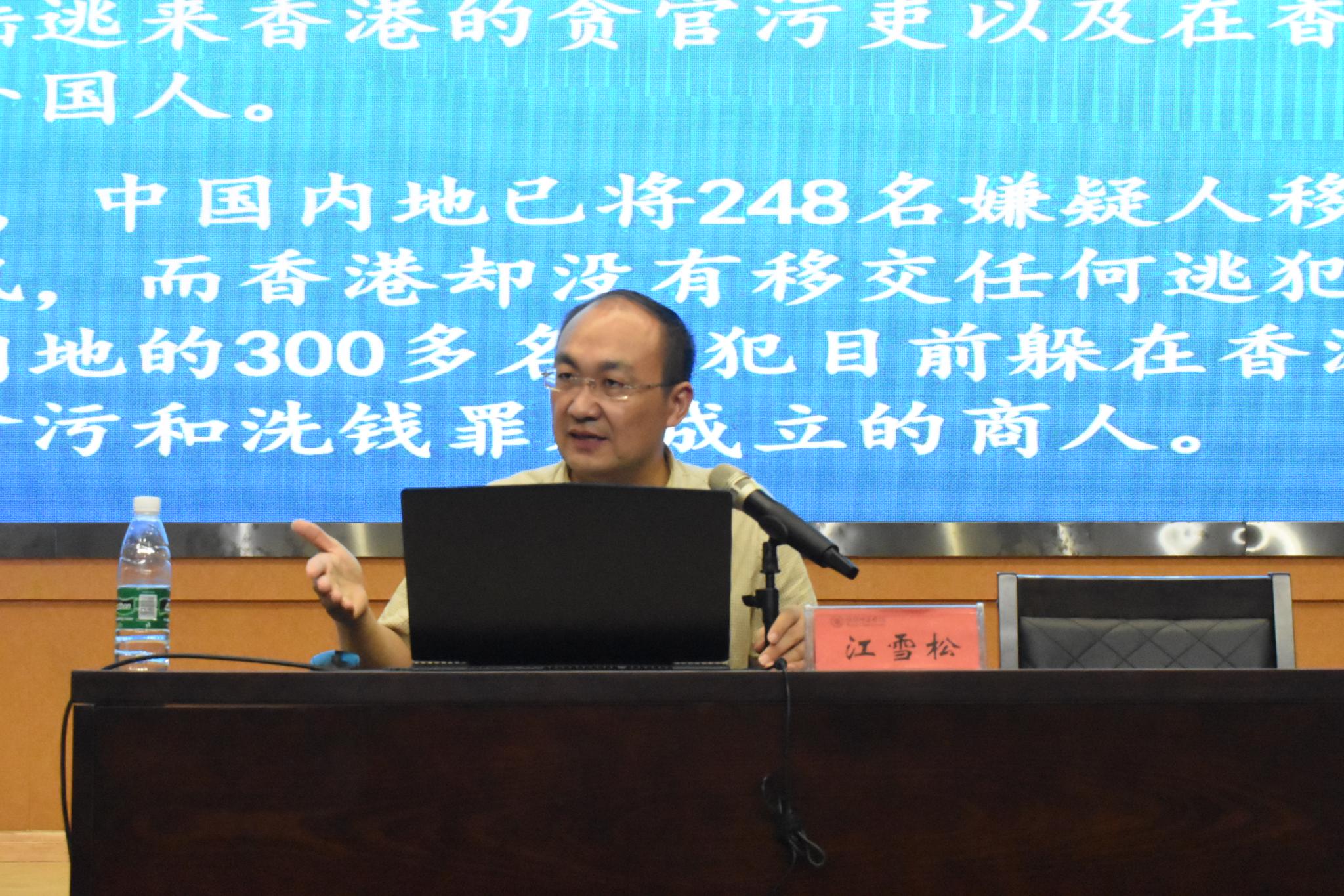 本次讲座的主讲人是法政公司江雪松教授。对于此次香港的“风波”,他指出,如果长期关注香港问题,就可以发现目前香港局势“既在意料之中,又在情理之外。”他以“风波起、风波恶、定风波” 三个方面为纲,详细介绍了香港修例的缘起、发展及可能走向。“反修例”风波为何而起?香港《逃犯条例》的修订内容真有问题吗?有谁在反对?江教授通过生活化、时事性的案例对专业知识进行解释,让青年学子们很快理解并产生共鸣。江教授强调了修例的法理正当性,应当纠正“犯罪特许”,没有任何国家可以容忍嫌疑人从国家的某个地方逃到另一个地方来逃避司法制裁。