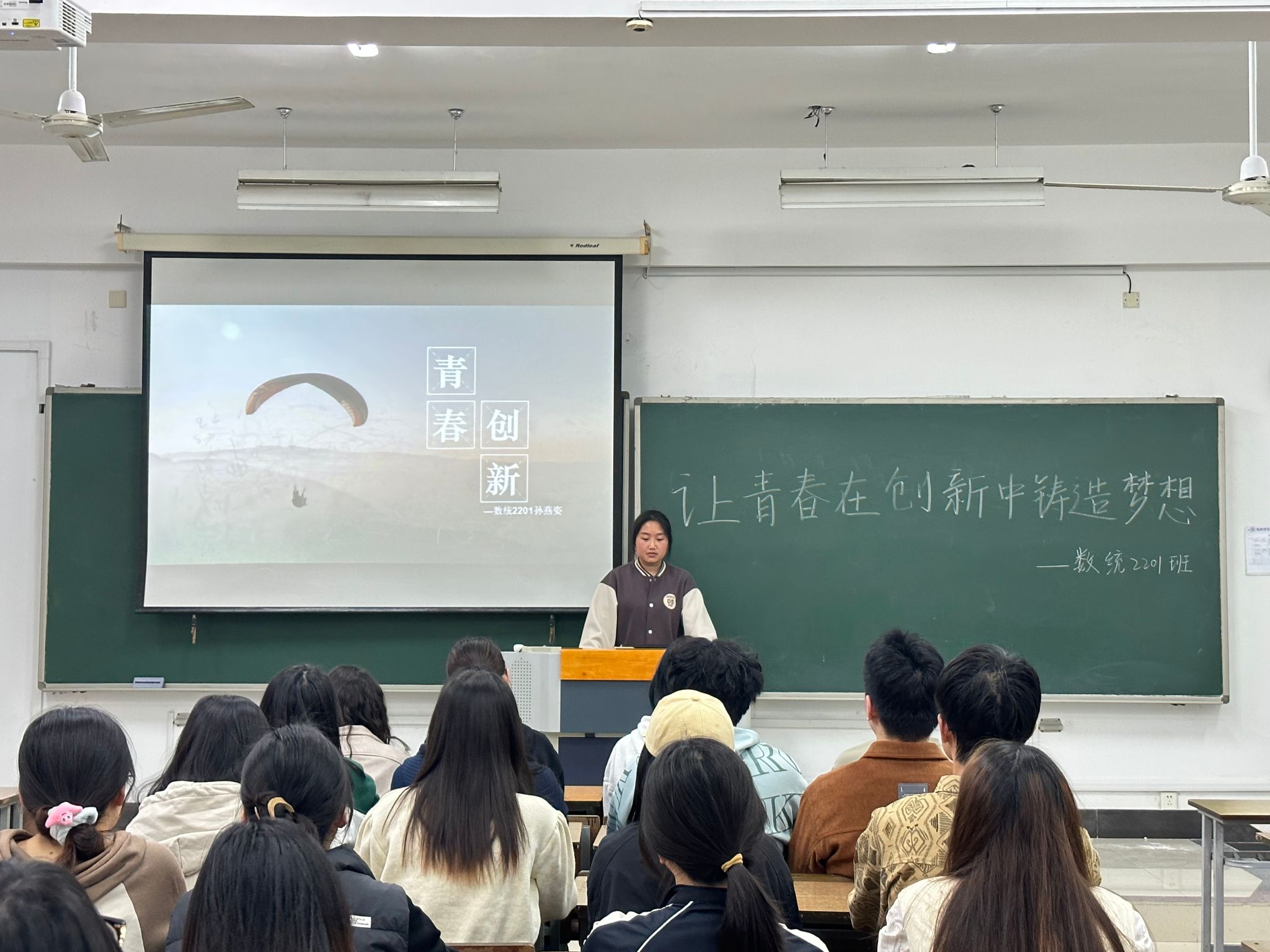 为加强对当代老员工思想价值观的教育,数统2201班于4月10日在理南201举办“让青春在创新中铸造梦想”主题活动。数统2201班全体同学参与活动,宣传委员孙燕姿主持本次活动。