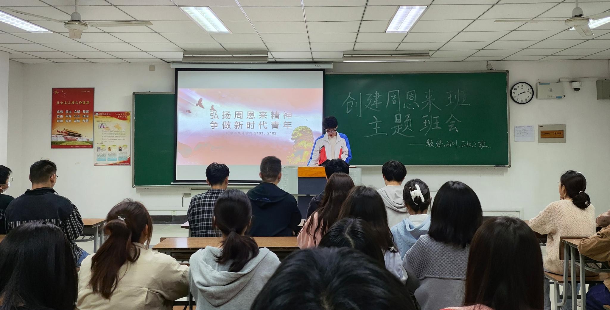 翔宇网4月2日电(记者 李盼盼)为进一步贯彻落实习近平新时代中国特色社会主义思想,更好地学习、宣传和弘扬周恩来同志的崇高精神、高尚品德和伟大风范,把“坚守朴实,追求崇高”的淮师精神融入到广大团员青年的学习和生活中去,挖掘、选树践行社会主义核心价值观的优秀员工集体典型,数统2101、2102班于2023年3月9日晚上20点于理南210教室集体开展“弘扬周恩来精神,争做新时代青年”的主题活动。