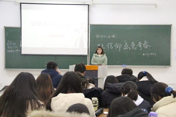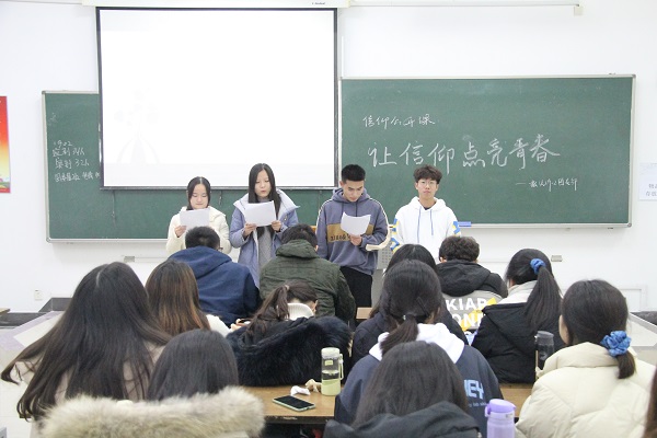 活动伊始,主持人以PPT的形式向同学们阐明了信仰的定义。紧接着,同学们观看了一段视频,真切地感受到了信仰的魅力。随后,由罗梦蝶等四位同学给大家带来朗诵《信仰永恒》,短短几分钟将活动气氛推向了高潮。在此氛围下,丁妍给同学们讲述了一个关于信仰的小故事,苏格拉底高尚的信仰引得同学们深思。