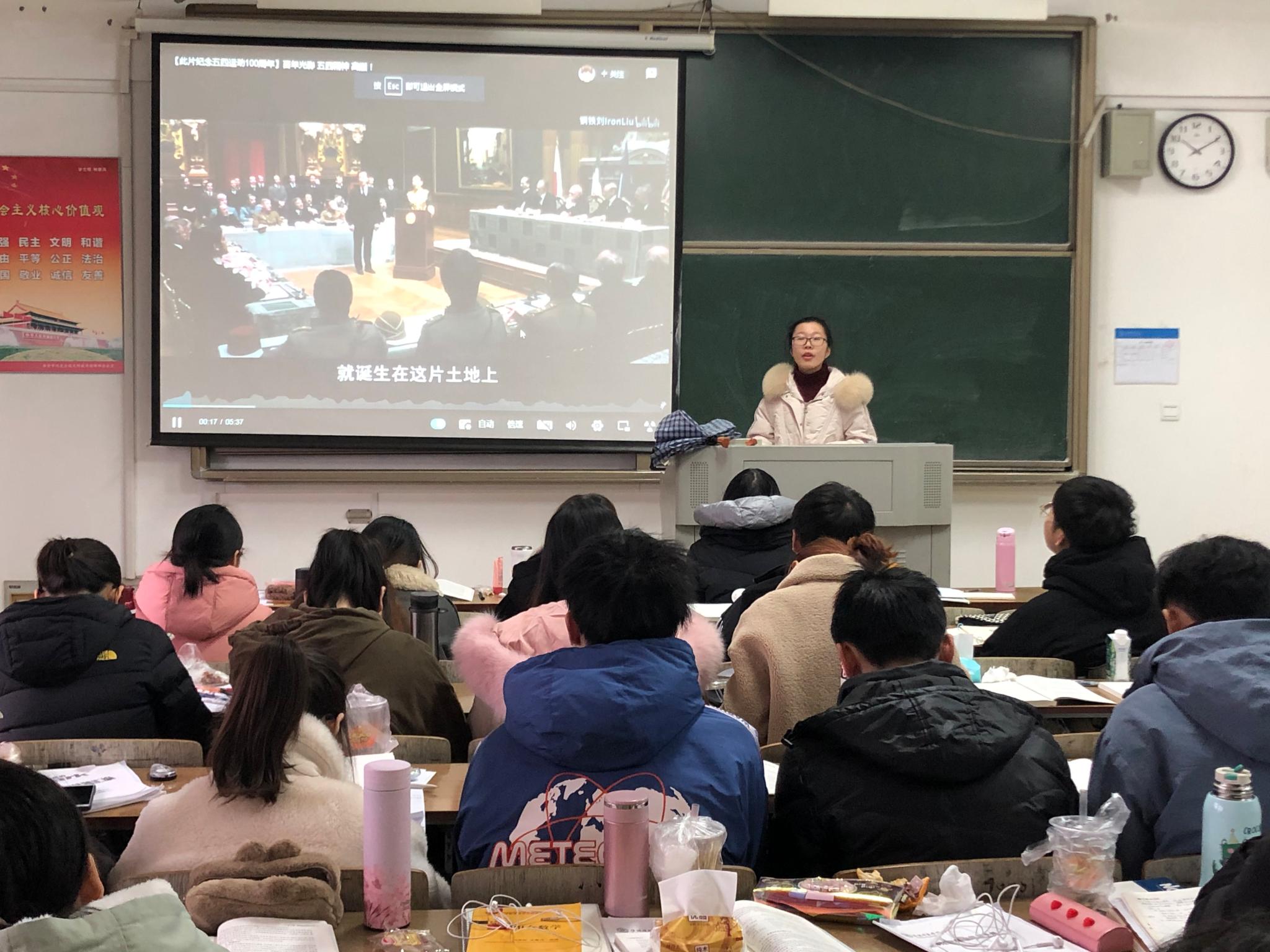 活动伊始,由团支书播放五四运动的相关视频。视频中的青年们在民族危亡之际,用崇高的爱国热情担起历史的使命,充分激起了在座同学的爱国之情。紧接着,由梁艳婷发表感想,她指出,五四运动离我们远去已近百年,但时刻提醒着我们要勿忘国耻、不断奋斗。随后,同学们观看视频《让青春在党和人民最需要的地方绽放绚丽之花》。视频中,昔日的五四青年为了国家的安全与尊严,不惜流血斗争;而新时代的新青年,在抗疫期间贡献出自己的青春力量,站在新的历史起点上,为生命之绽放再出发。观看过程中同学们被五四精神所感动,响起热烈掌声。