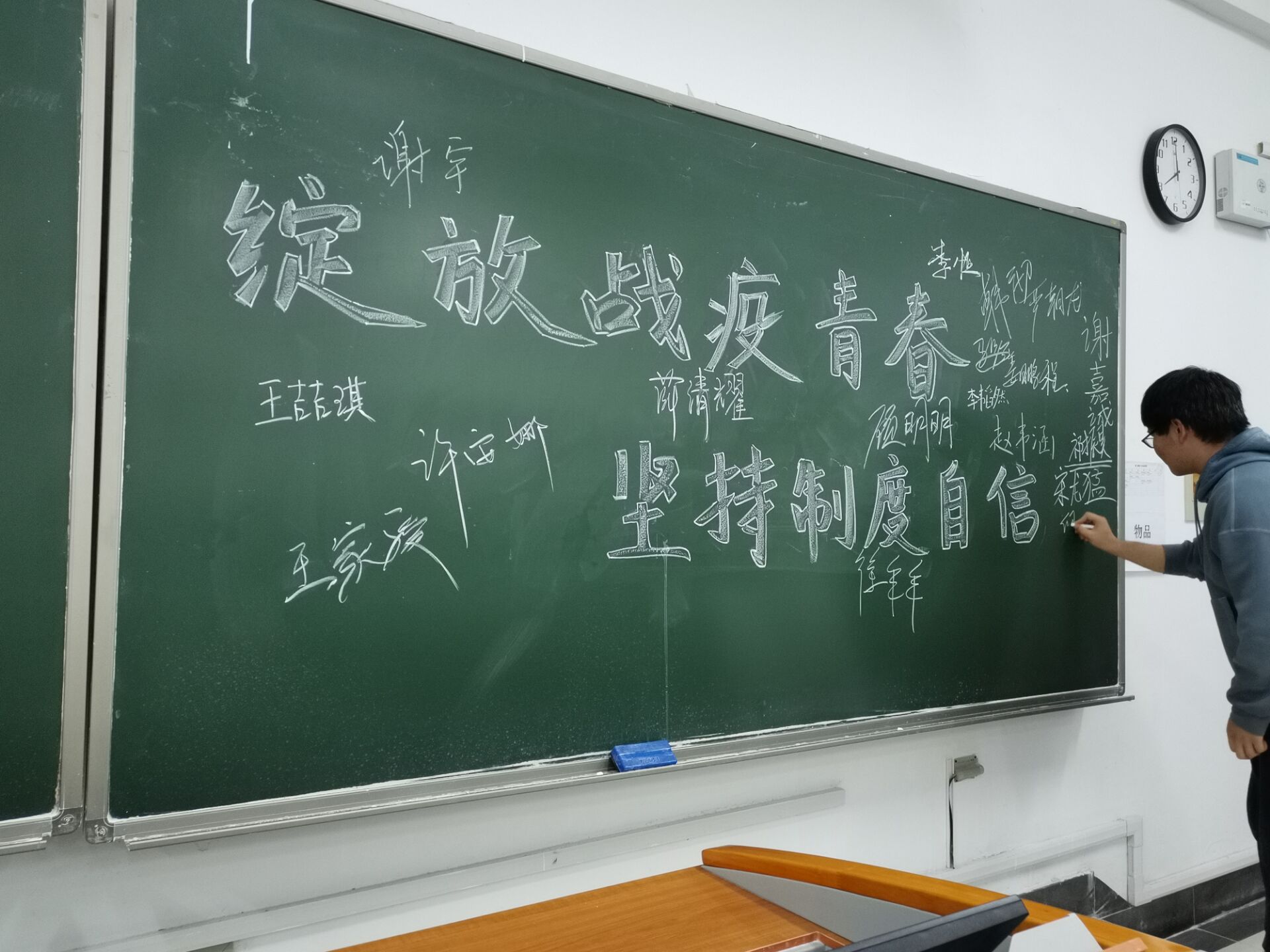 此次班团活动由1804班和2003班一同携手举办,准备充分,进展顺利。活动分为四个板块,第一个板块是由2003班的四位新生就制度自信进行宣讲,其中纪雅琪同学列举了疫情期间防控工作取得的成效,肯定了社会主义制度的显著优势,她指出坚定制度自信是实现中国梦的先决条件,具备强大的前进动力。同学们纷纷表示赞同,就坚持制度自信各抒己见。第二个模块中,同学们通过表演情景剧《在一起》中的片段,真实演绎疫情期间的感人故事。此外,在第三个模块中,同学们用画笔记录疫情期间的感动瞬间,画出了天使、彩虹、万物复苏。活动的最后一个模块,同学们带着自己的作品上台合照留念,并在黑板上签下了自己的名字。活动顺利结束。