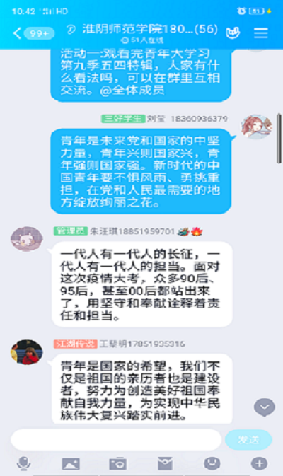 翔宇网5月7日(记者 刘莹)为弘扬五四精神,发展党和领导的教育,不忘初心,牢记使命,同时在此次防疫战斗中贡献力量,绽放青春,5月6日,数统1802团支部成员组织全体成员开展了一场以“战疫有我,青春同行”为主题的线上班团活动,旨在让同学们更加深刻的了解五四精神并践行其中。