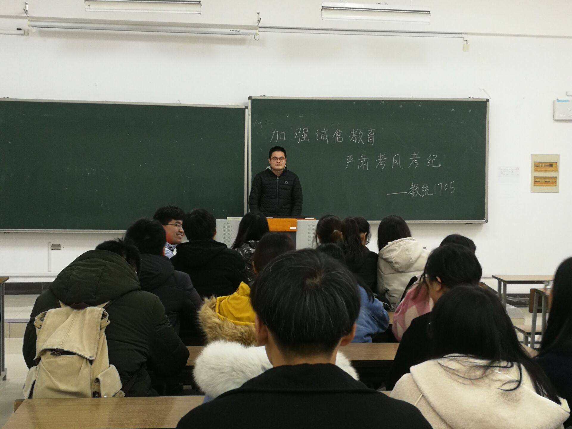 活动伊始,班长陈祺向同学们讲述有关考试的规章制度,并带领全班同学进行宣誓;其次,他列举了几个关于考试作弊的例子,并对考试作弊行为带来的危害进行了阐述,从而呼吁同学们诚信考试,诚信做人,用真实可信的成绩展现自己的学习能力和学习效果。其次,学习委员吕国阳向同学们传授了自己的学习经验和复习方法,以便帮助同学们更好的进行期末复习,争取更佳的期末成绩;活动的最后,班长组织“诚信考试,诚实做人”的签名活动,让同学争做崇尚诚信的好青年。