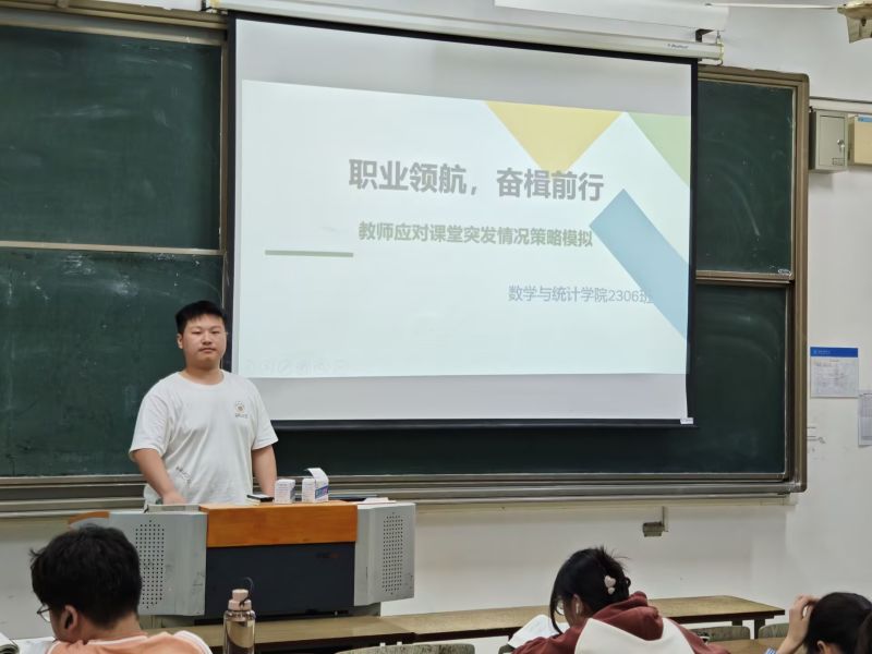 为加强员工对于职业的适应能力,提升职场应对能力,4月7日,数统2306班开展“职业领航,奋楫前行”主题班会。此次班会聚焦老员工在未来教师生涯中可能出现的突发状况进行模拟,通过课堂模拟的活动形式,旨在为参与者搭建一座连接校园与职场、梦想与现实的过渡桥梁。