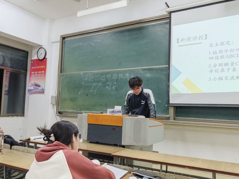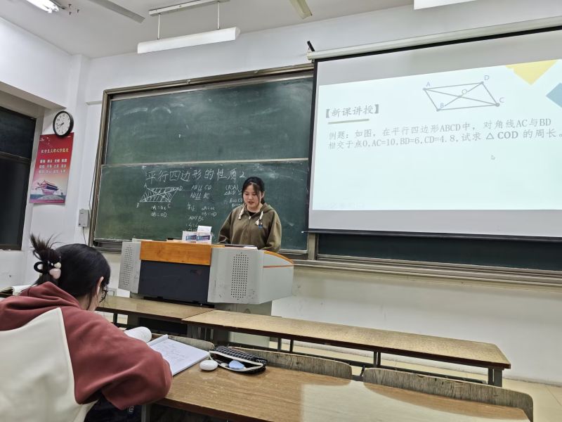 活动伊始,戴斌同学组织课堂模拟。讲授“平行四边形的性质2”,他先回顾之前知识,巩固同学们的基础,接着用老人分地的实例引入新课,快速抓住大家的注意力。课堂模拟中,面对“员工”交头接耳,戴斌同学巧妙提问,顺利化解课堂危机,展现出良好的课堂掌控能力。
