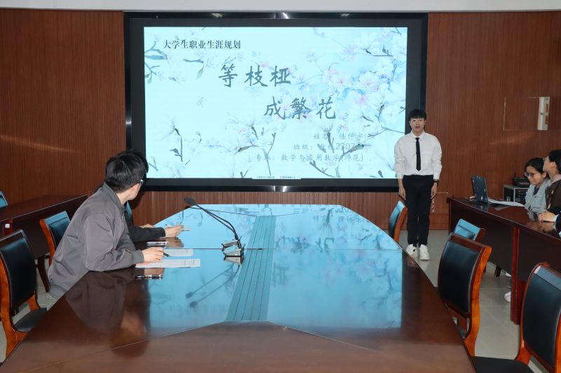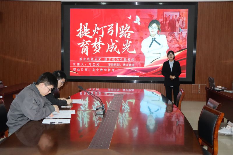 就业赛道的马艺闻同学讲述了自己的三步职业蓝图----“筑基”、“深耕”、“致远”,并结合自身专业和优势,进行了详细的职业规划展示。她说“教育是一棵树摇动另一棵树,一朵云推动另一朵云。”未来,她将坚守初心,用严谨和热情诠释“数魂”,用经验和开放传递“师道”,用创新和坚守书写“担当”。