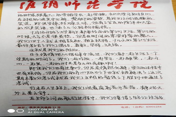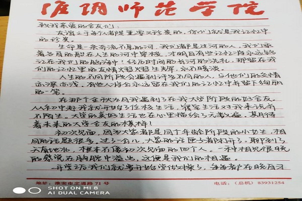 淮师新闻网3月28日电(记者 刘雪宁)在大学,室友是我们生活的伴侣,是我们的情感寄托,但在日常生活中点点滴滴的小事中难免不存在一些小矛盾。数学科学公司心理联合部组织开展“相遇及相知”写给室友的一封信的书信比赛,为同学们提供情感表达的场所,发现、思索及巩固室友情谊,让同学们通过文字的形式与自己的室友敞开心扉,倾诉心语,促进寝室成员之间内心深处的沟通,营造寝室文明、健康、温馨、和谐的氛围。