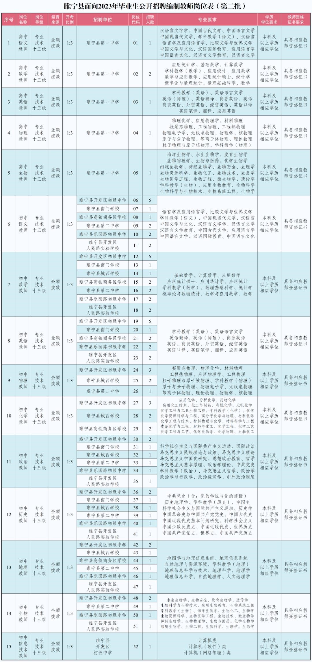 睢宁县面向2023年毕业生公开招聘编制教师公告在徐州人力资源和社会保障网(http://hrss.xz.gov.cn)、睢宁门户网(http://www.cnsn.gov.cn/)、“睢宁教育星空”微信公众号发布,具体的岗位名称、招聘人数、资格条件等详见《睢宁县面向2023年毕业生公开招聘编制教师岗位表(第二批)》(以下简称《岗位表》)。