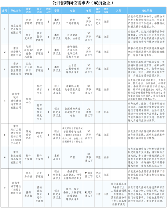 招聘岗位:科创中心科技项目专员1人、能源环境项目研发专员1人;南京路灯工程建设有限责任公司(子公司)设施运营中心智能化专员1人。