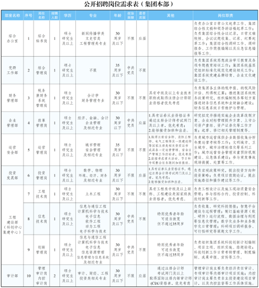 此次计划面向社会(含应届毕业生)公开招聘22人,其中集团本部11人,成员企业11人。招聘岗位如下: